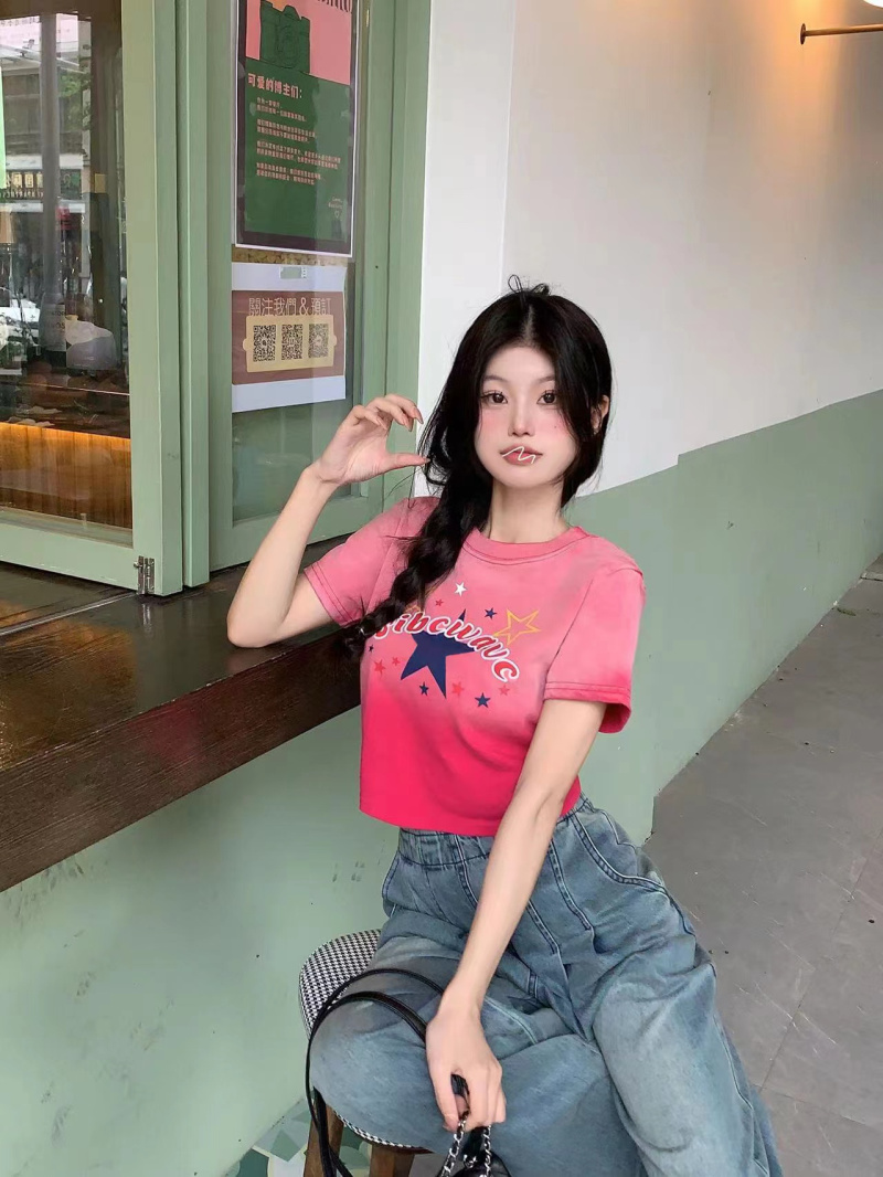 RM16187#美式复古洗水炒花渐变短袖字母扎染短款上衣