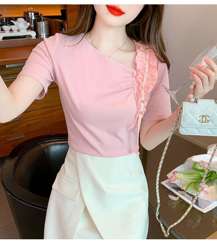 RM16484#夏装木耳边褶皱斜领设计感小众气质时尚上衣短袖T恤