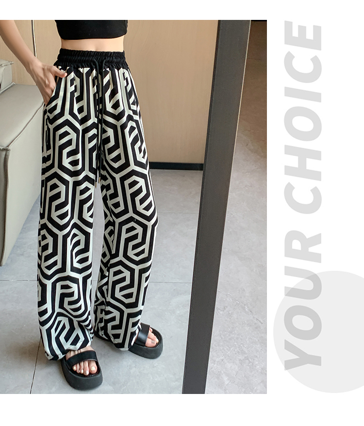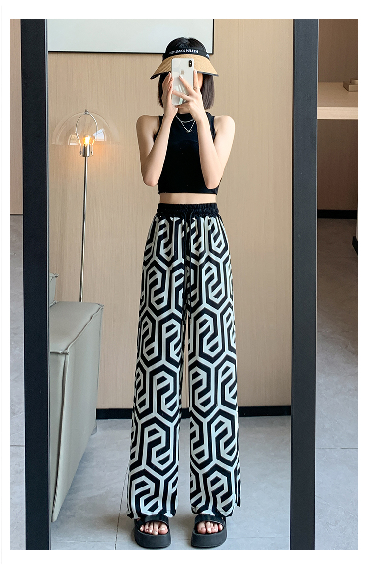 RM16667#冰丝印花设计款直筒长裤女2023夏薄款欧货腰头撞色花纹阔腿裤