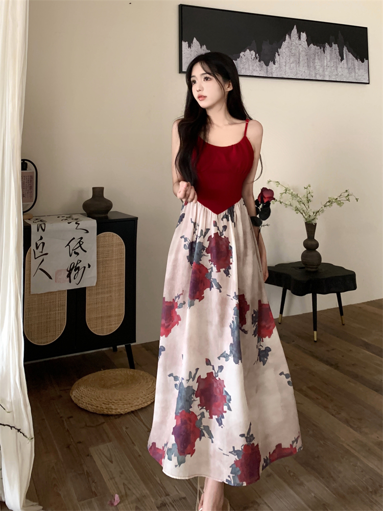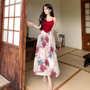 RM16791#沙漠玫瑰新中式复古印花吊带连衣裙女2023夏季高腰长款裙子