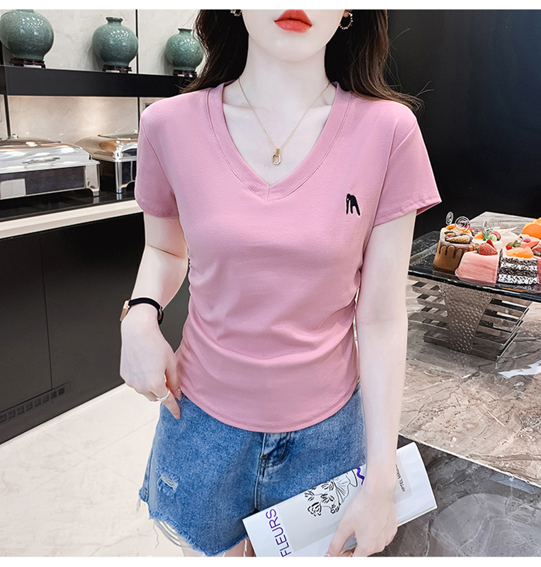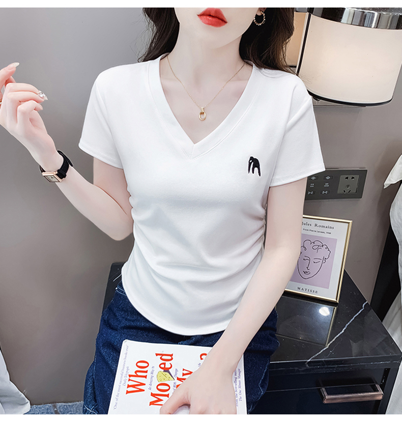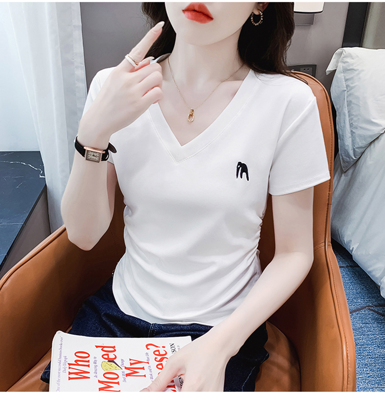 RM17119#短袖t恤女夏设计感V领收腰皱褶紧身内搭洋气独特上衣ins