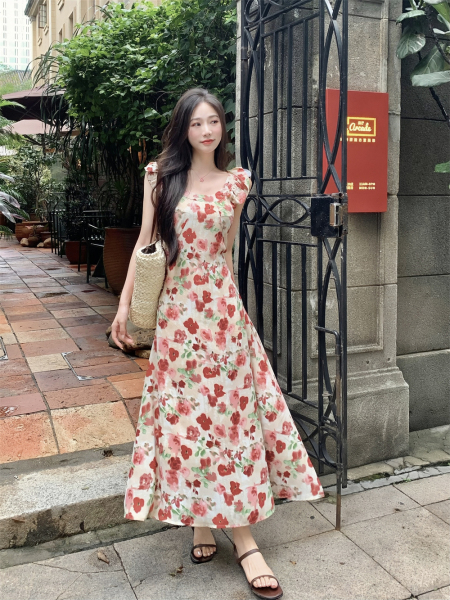RM17327#法式复古碎花连衣裙女夏季新款飞飞袖设计感收腰显瘦A字长裙