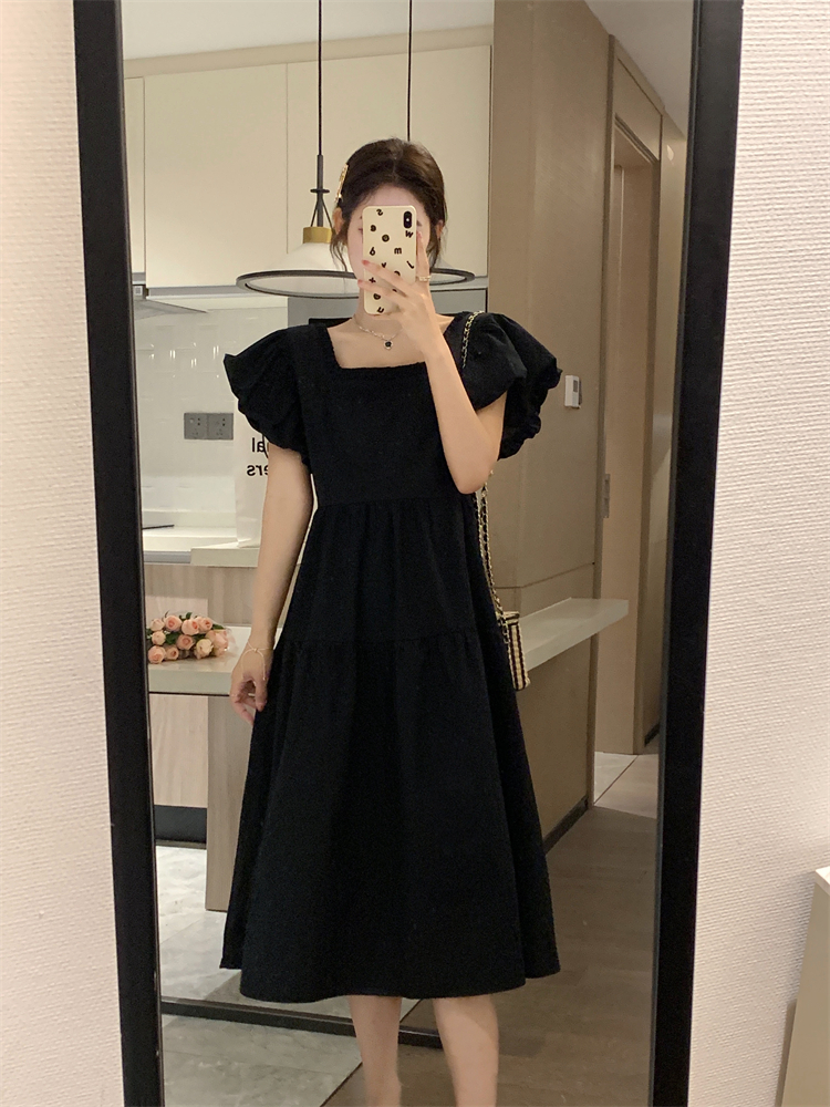 RM17420#韩版方领宽松高腰显瘦泡泡袖中长款过膝连衣裙