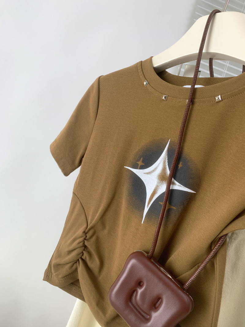RM17588#夏季设计感纯欲甜辣性感印花领口柳丁褶皱正肩短袖T恤女上衣