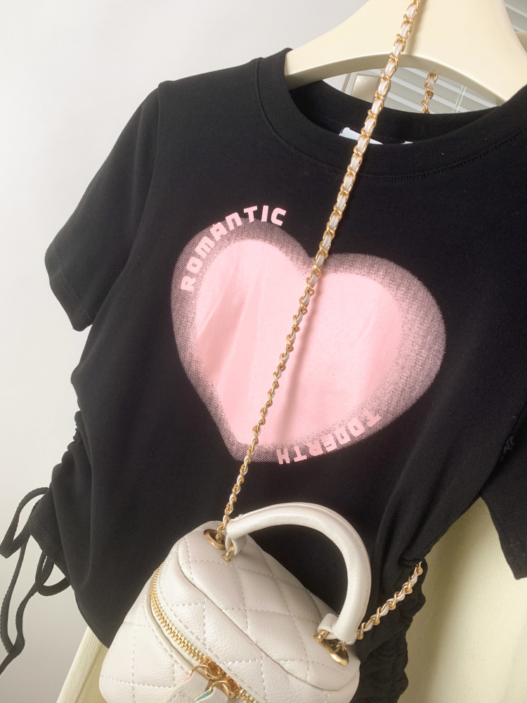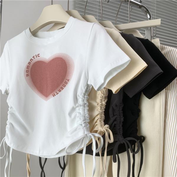 RM17589#短款女上衣夏季甜辣风露腰爱心印花短袖体恤抽绳正肩T恤