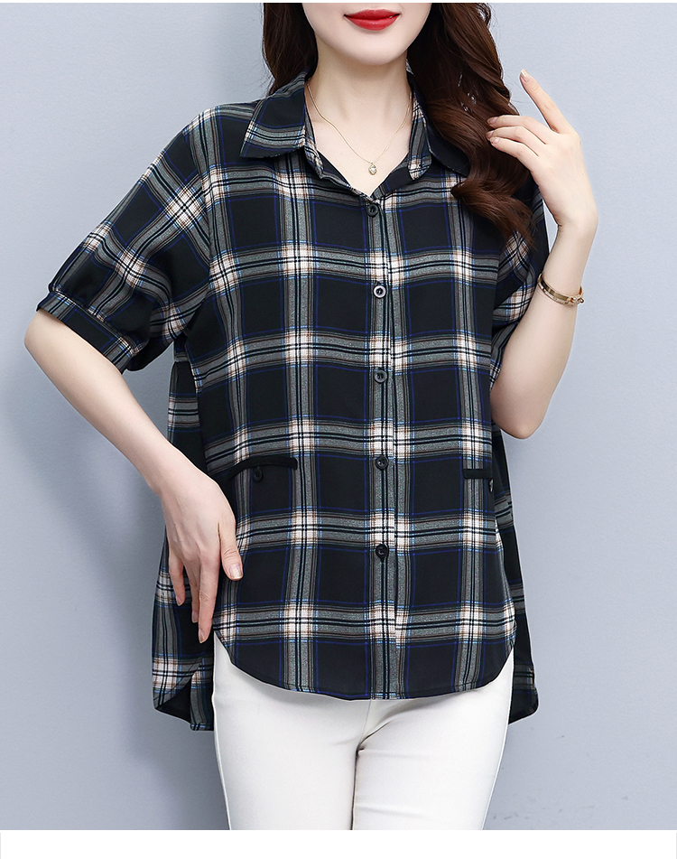 RM17946#格子短袖衬衫女2023夏新款大码衬衣前短后长宽松显瘦中年妈妈上衣