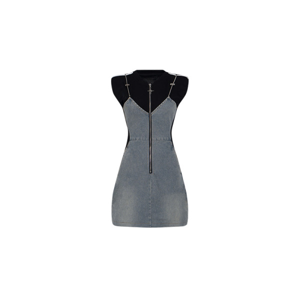 RM18080#气质减龄牛仔无袖连衣裙女夏小个子复古小心机别致显瘦拼色短裙子