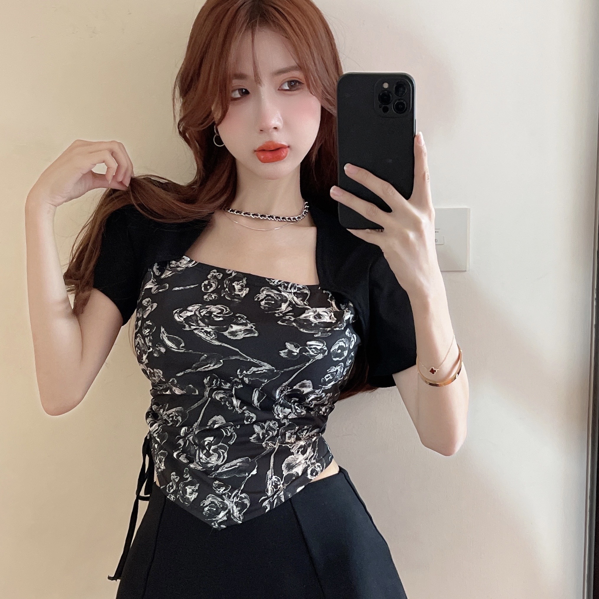 RM18317#复古印花拼接假两件休闲百搭T恤上衣