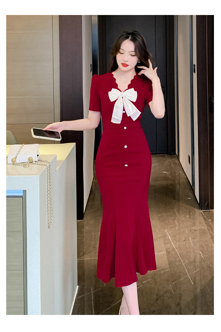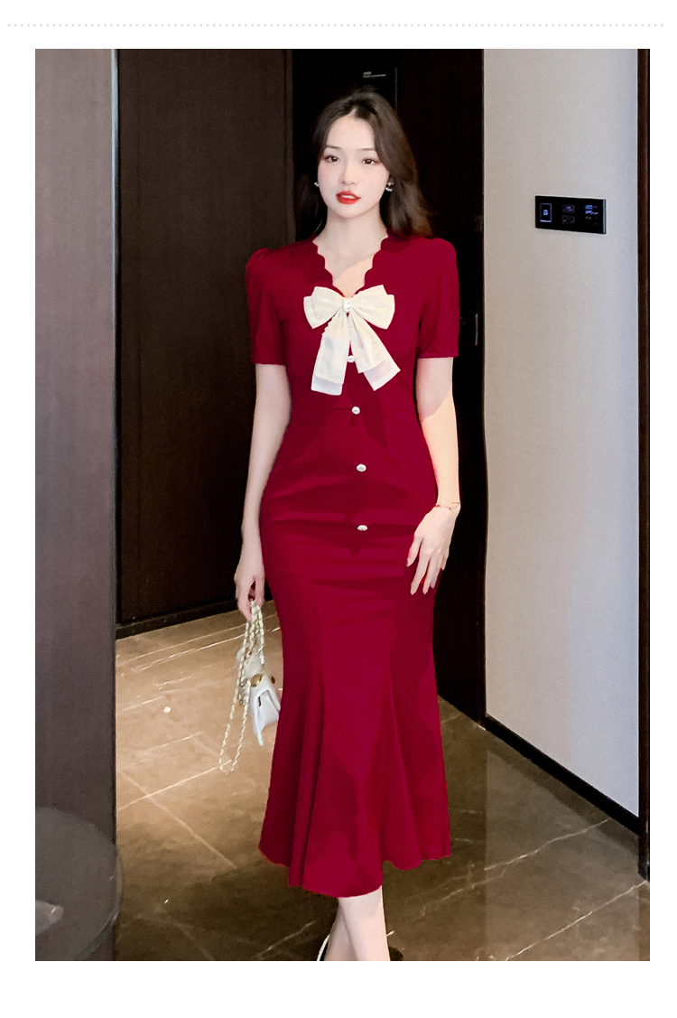 RM18691#酒红色敬酒服新娘法式鱼尾订婚礼服连衣裙缎面回门便装小个子修身