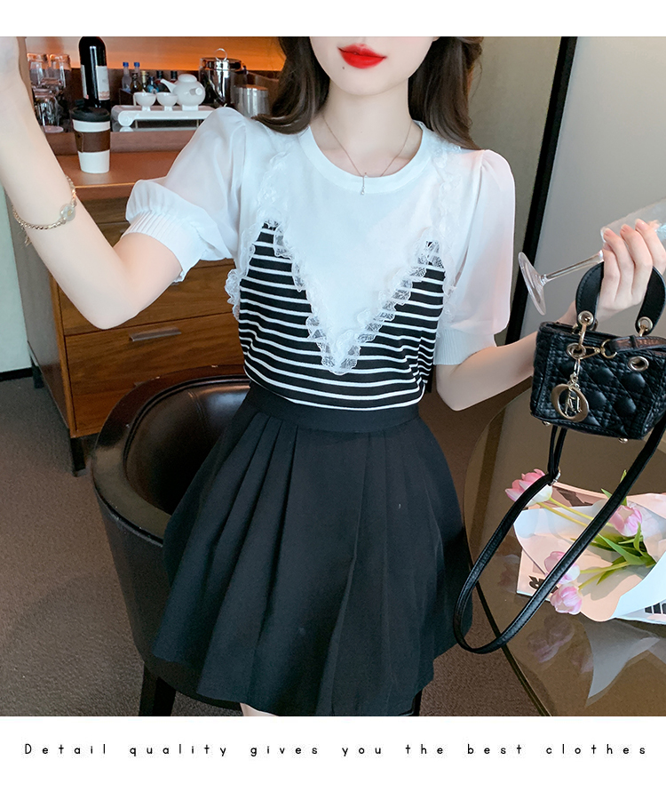 RM18472#雪纺短袖拼接条纹针织假两件2023年夏季蕾丝花边上衣小衫女