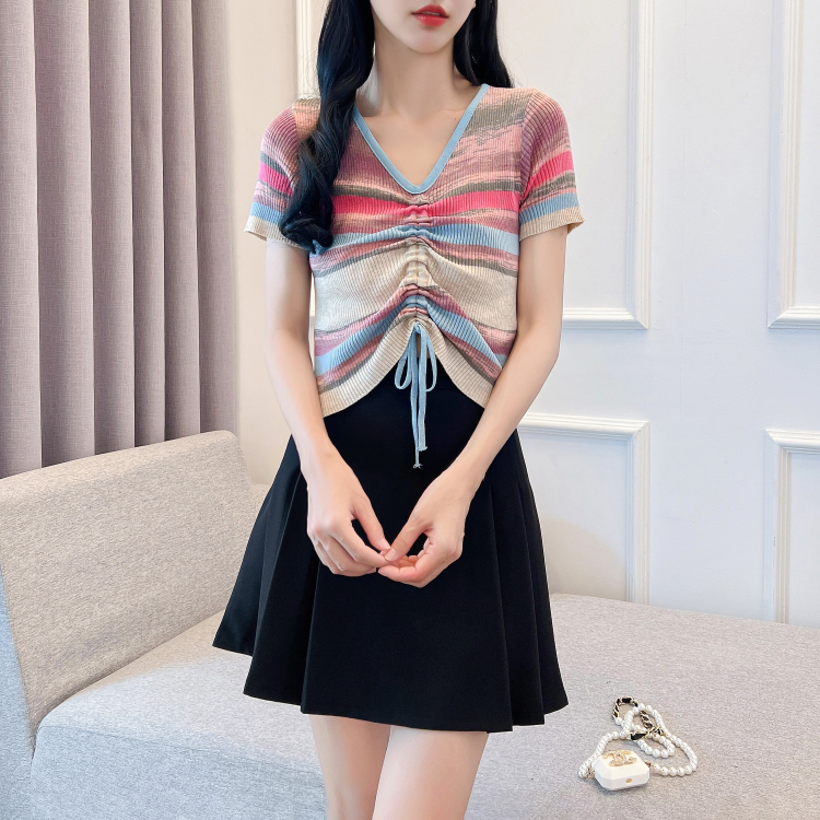 RM18421#夏季新款ins设计感V领抽绳辣妹短款T恤冰丝针织女