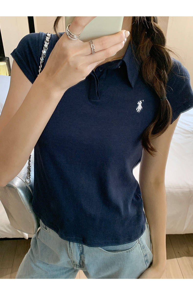 RM18865#美式复古polo衫正肩短袖t恤女夏季设计感小众修身辣妹上衣