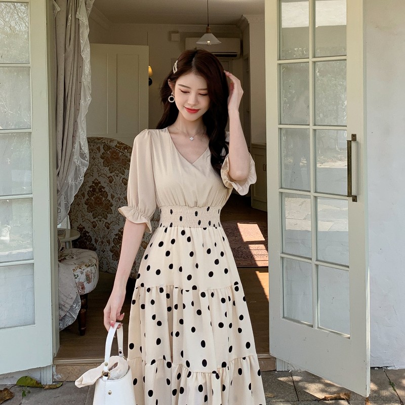 RM18956#夏季法式甜美V领雪纺连衣裙气质杏简约假两件韩版波点长裙