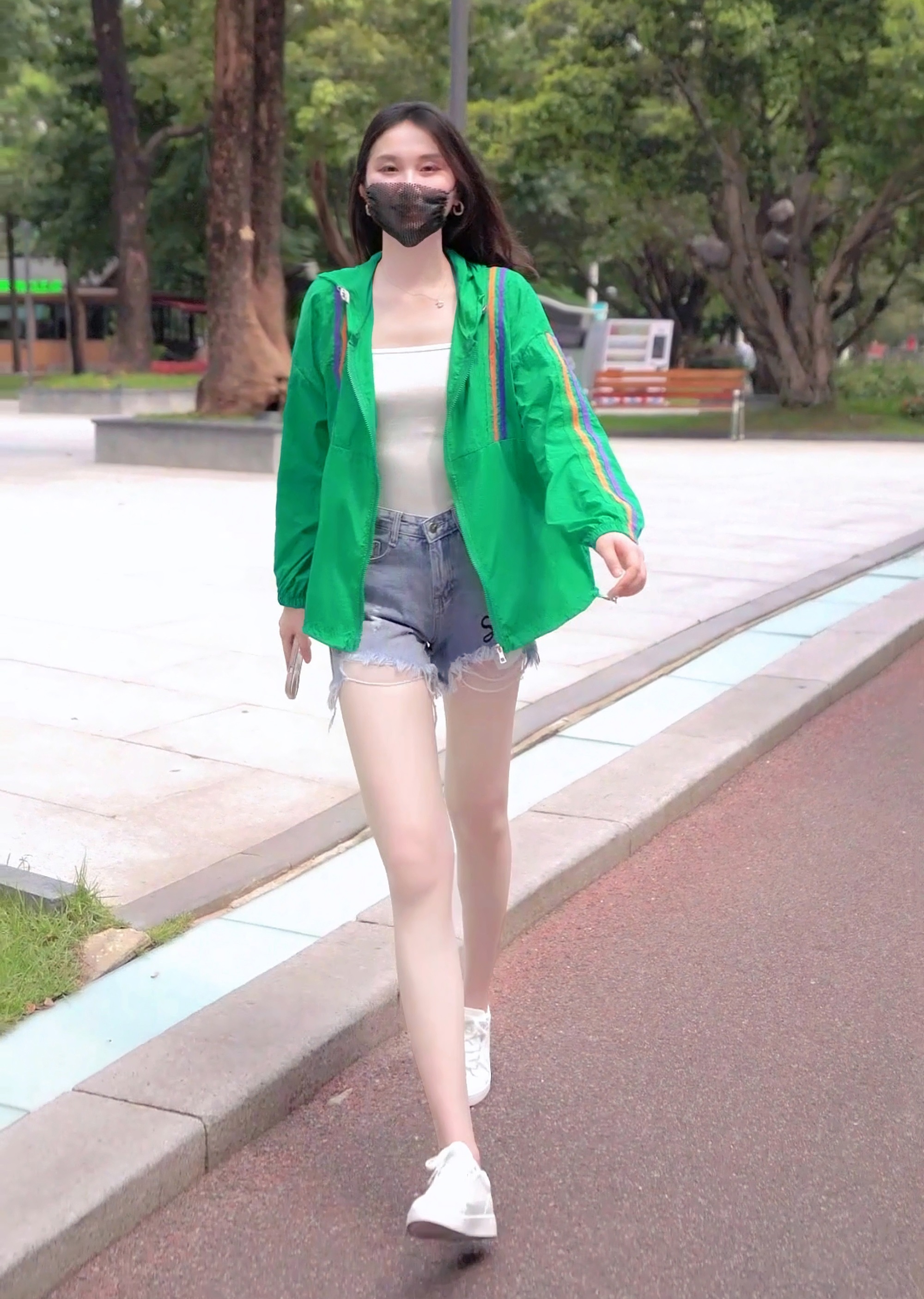 RM18961#欧货三条杠拼接撞色连帽防晒衣外套女夏季宽松透气中长开衫冲锋衣