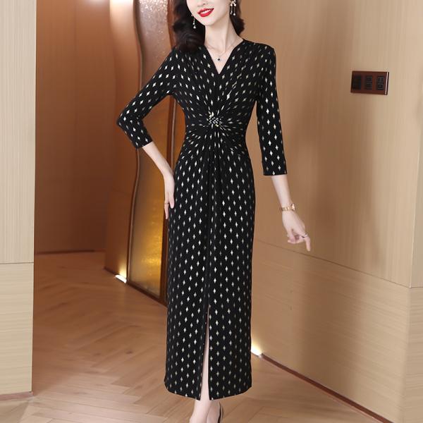 RM19046#新款黑色高端洋气贵妇气质显瘦V领长款修身花纹连衣裙女
