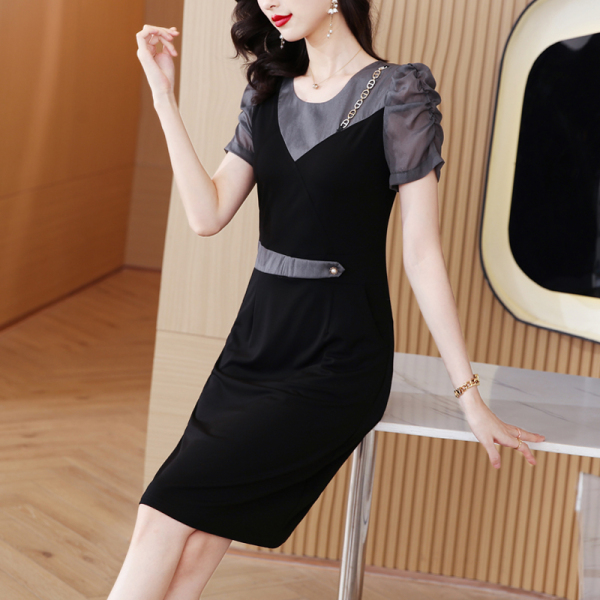 RM19113#夏装新款时尚修身短袖拼接圆领连衣裙