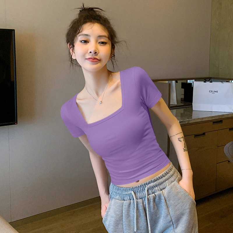 RM19244#32s双纱220g 95%棉 5%氨纶方领短袖T恤女夏ins短款女上衣