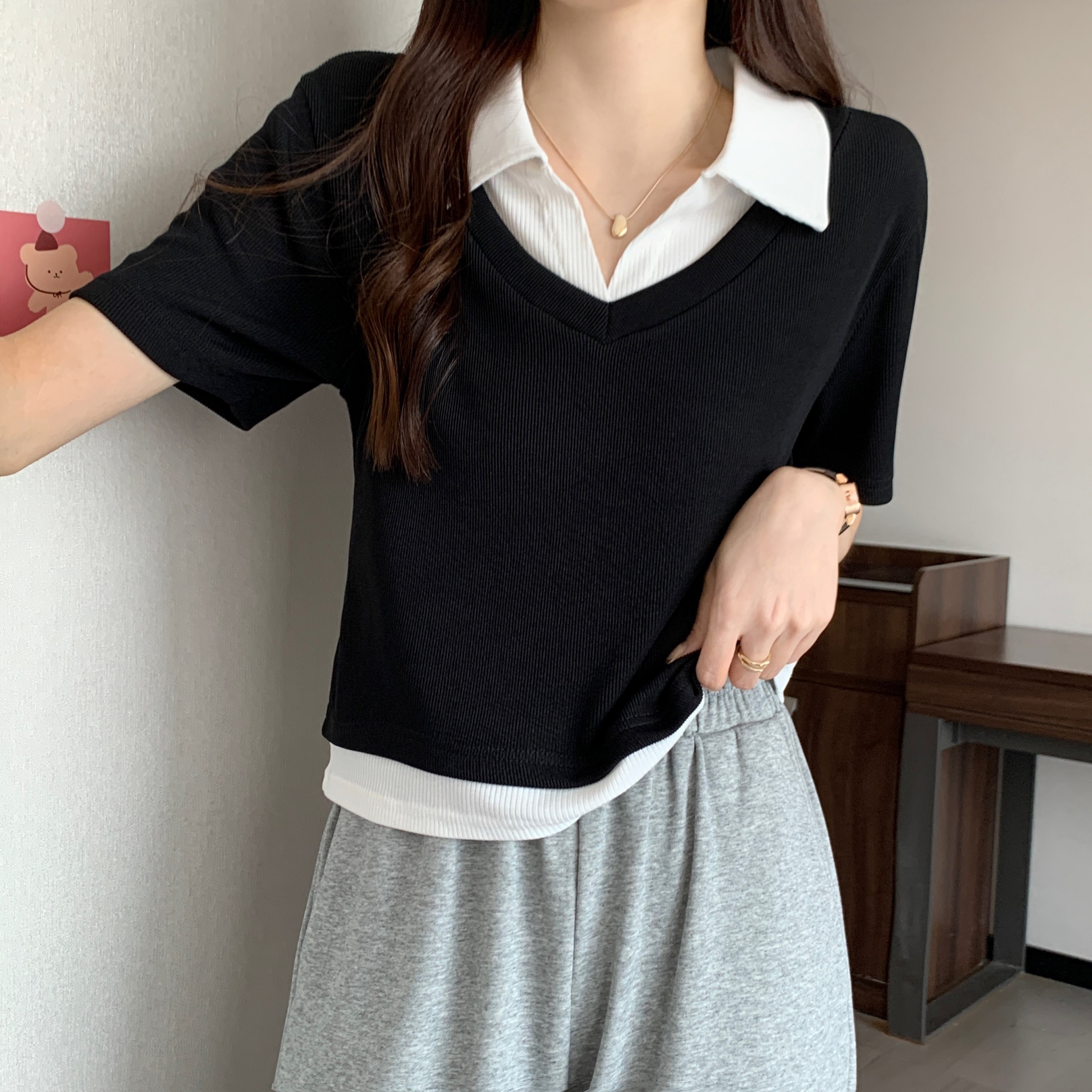 RM19403#大码 假两件POLO领短袖T恤女2023夏新款拼接体恤V领正肩上衣