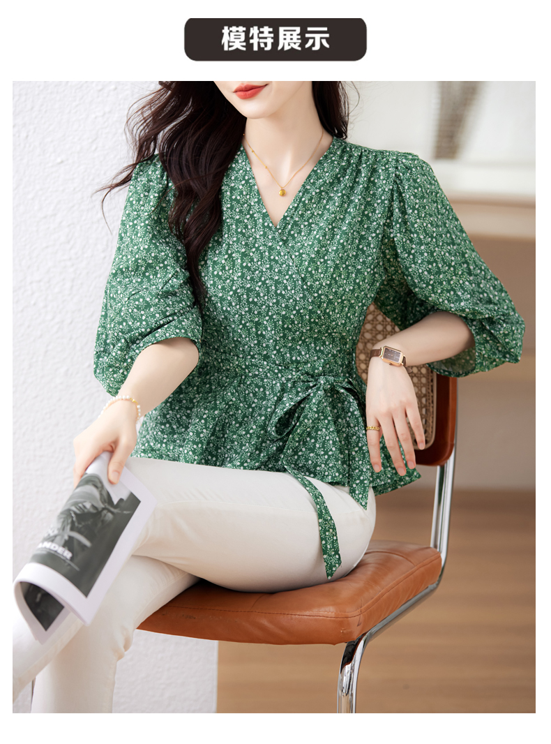 RM19497#法式复古高级感绿色v领碎花衬衫女夏独特短款上衣卡腰洋气小衫