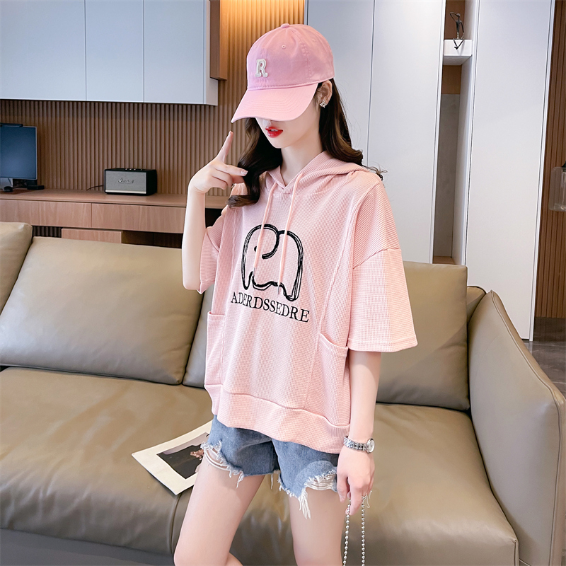 RM19540#夏季新款小众设计感华夫格卡通刺绣连帽短袖t恤女上衣