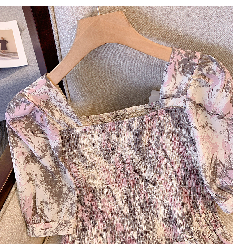 RM19568#大码女装遮肚子方领印花正肩上衣女夏季胖mm洋气碎花雪纺衬衫