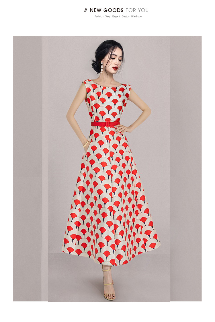 RM19899#夏季新款韩版时尚印花圆领大摆A字长裙收腰显瘦高级感连衣裙