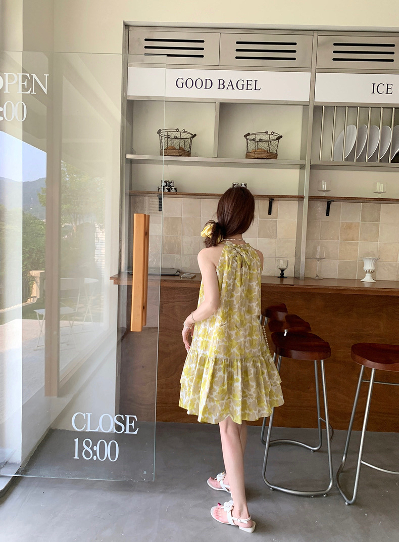 RM19793#夏日清新碎花A字后背蝴蝶结挂脖无袖连衣裙多巴胺穿搭
