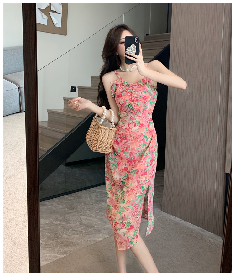 RM19749#时尚修身印花吊带荷叶边开叉显瘦连衣裙中长款开叉性感裙