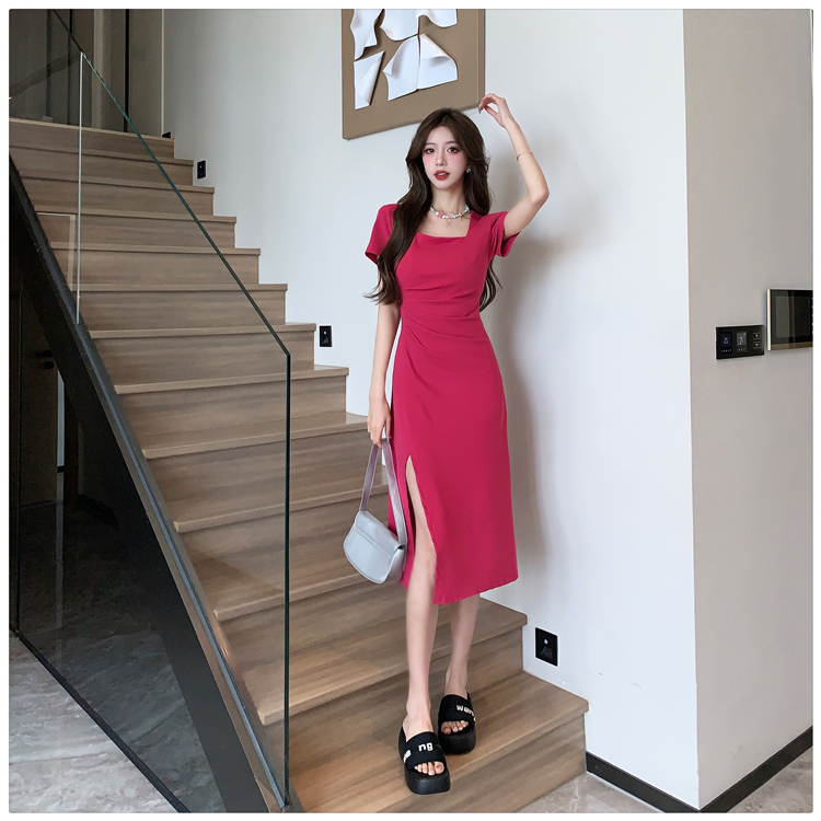 RM19750#粉色方领连衣裙遮肚显瘦裙子女夏季设计感开叉不规则长裙