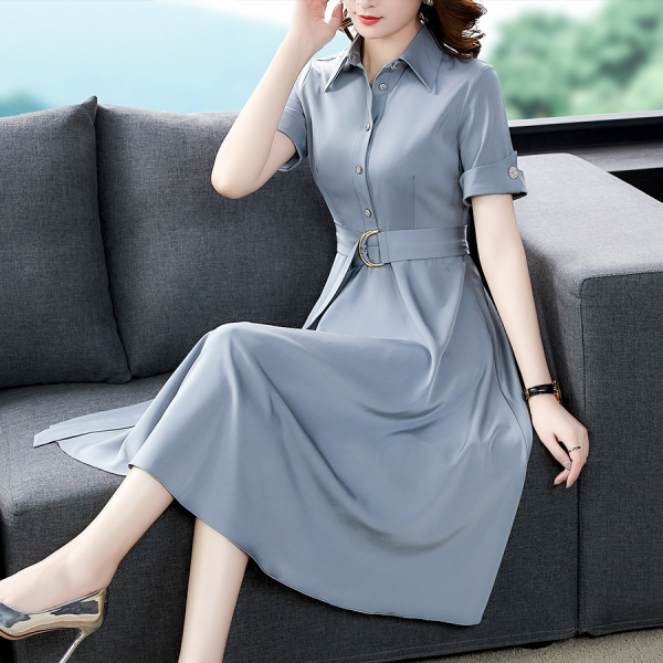 RY1703#醋酸缎面连衣裙翻领短袖收腰裙子过膝中长款衬衫裙女