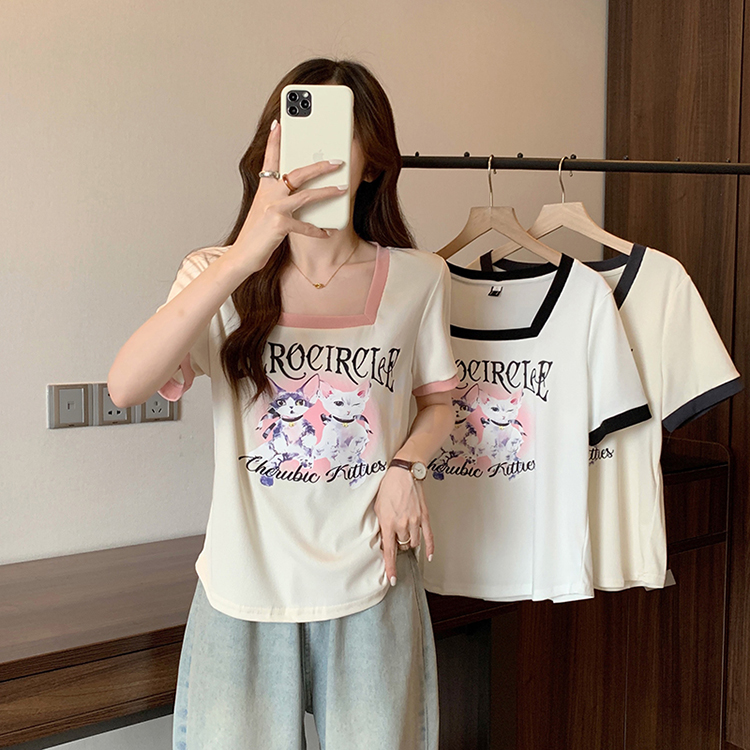 RM20239#夏装新款胖mm美式设计感显瘦方领猫咪印花短袖T恤潮