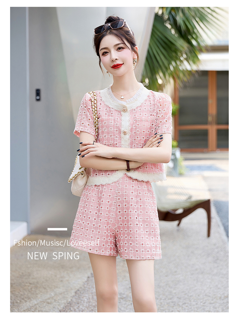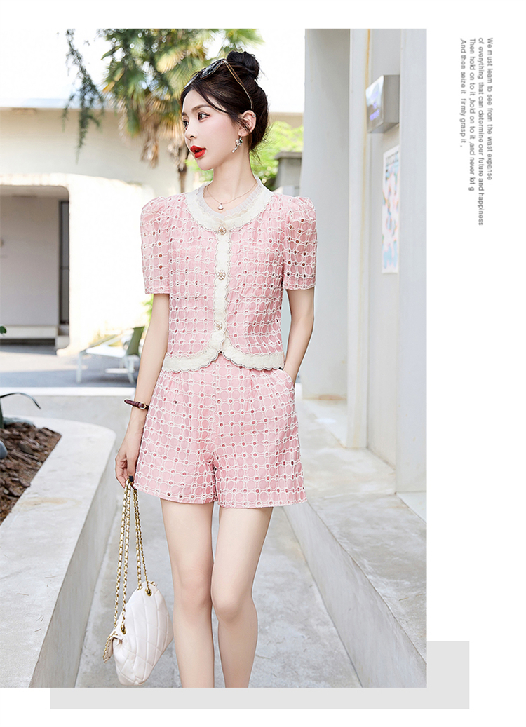 RM20267#欧洲站2023夏季新款欧货时尚精品短袖镂空上衣+短裤两件小香套装