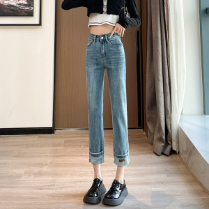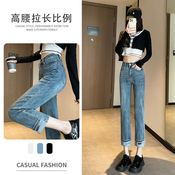RM20812#卷边烟管裤女2023秋冬新款高腰八分小个子拼接窄版直筒牛仔裤