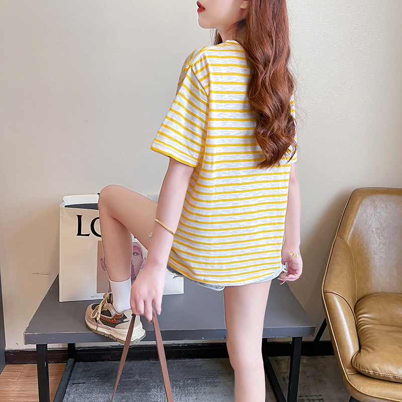RM21253#条纹短袖t恤女夏2023条纹修身短款圆领口袋上衣大码女装200斤