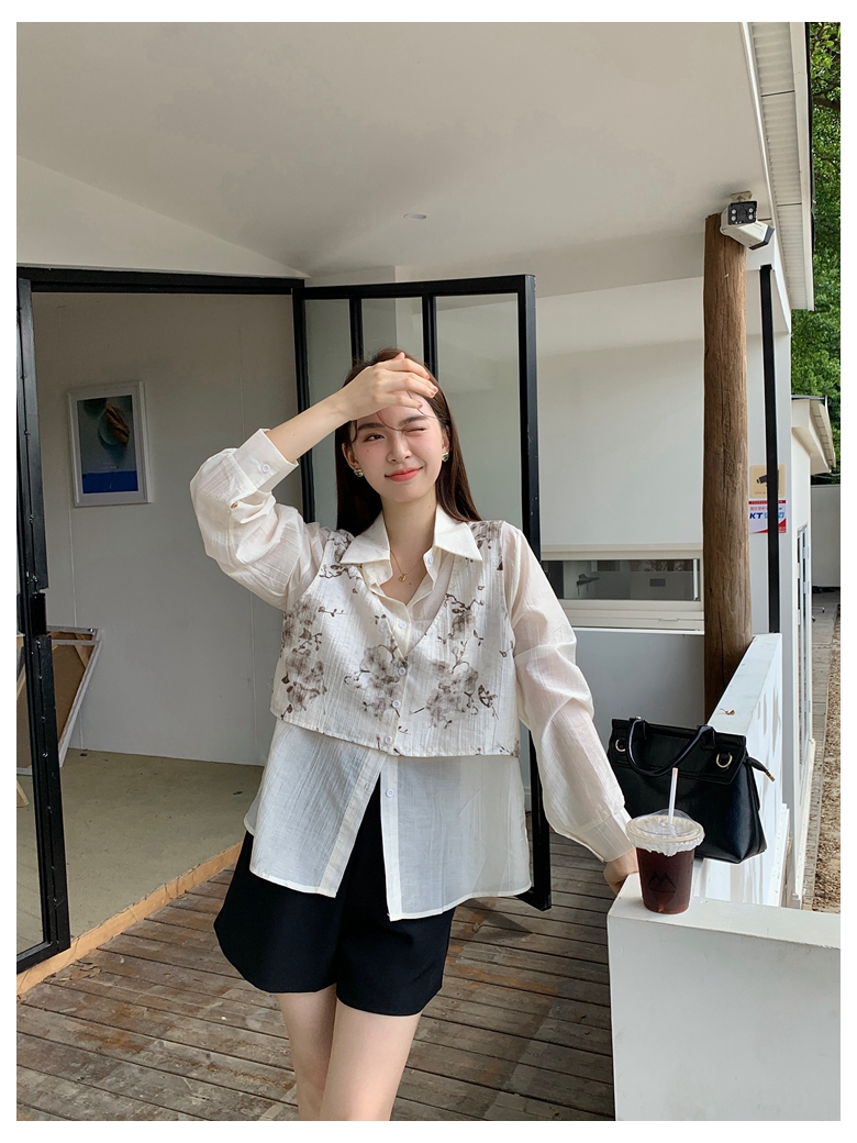 RM21261#小众设计复古水墨晕染假两件仿真丝长袖衬衣