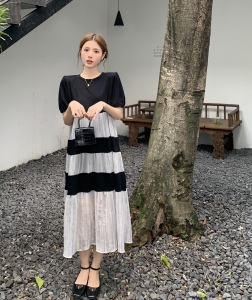 RM21359#气质减龄时尚洋气百搭显瘦遮肉短袖长款拼色宽松休闲连衣裙
