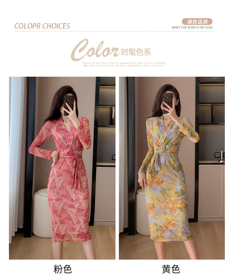 RM21970#新款网纱修身黄色碎花包臀显瘦气质优雅中长款连衣裙