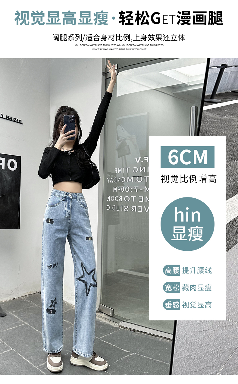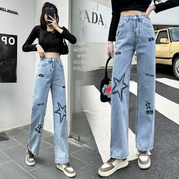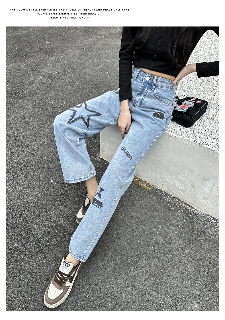 RM22043#高腰刺绣牛仔直筒裤女2023秋季新款韩版宽松哈伦烟管阔腿长裤