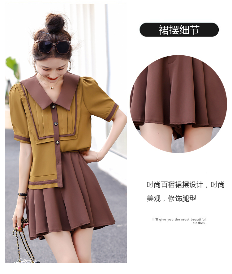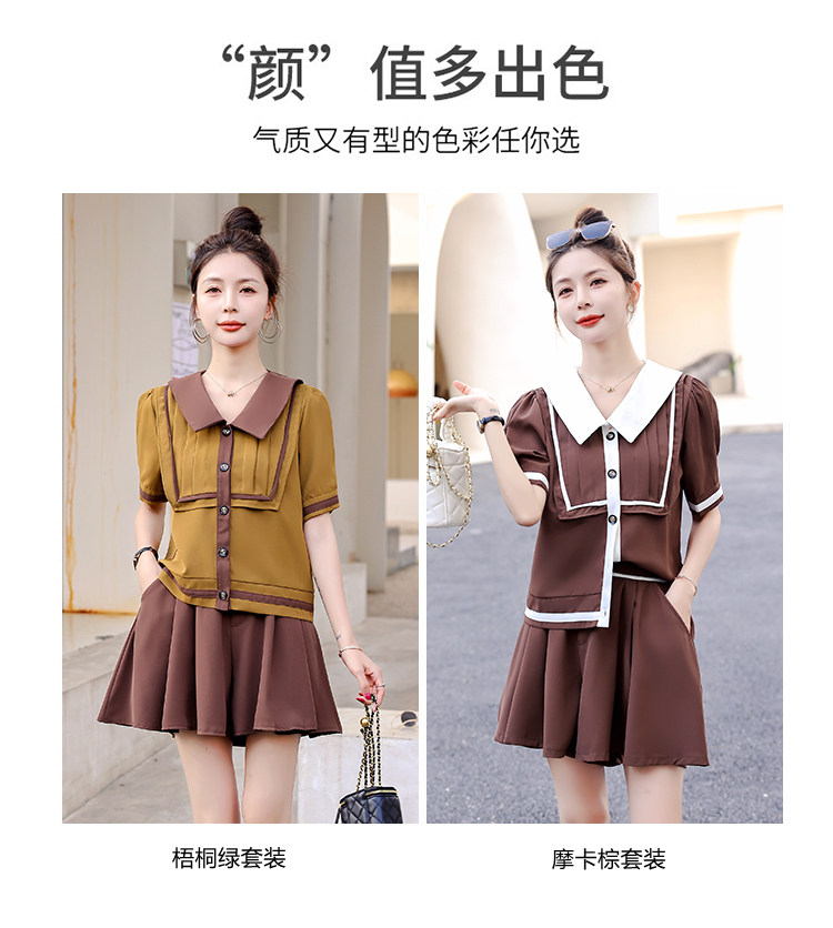 RM22085#时尚休闲套装女2023夏季撞色泡泡袖翻领短袖上衣裙裤两件套