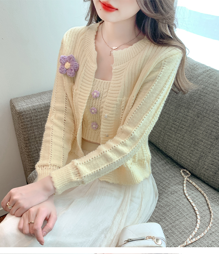 RM22104#甜美立体花朵针织套装女2023春秋新款吊带背心+毛衣外套两件套