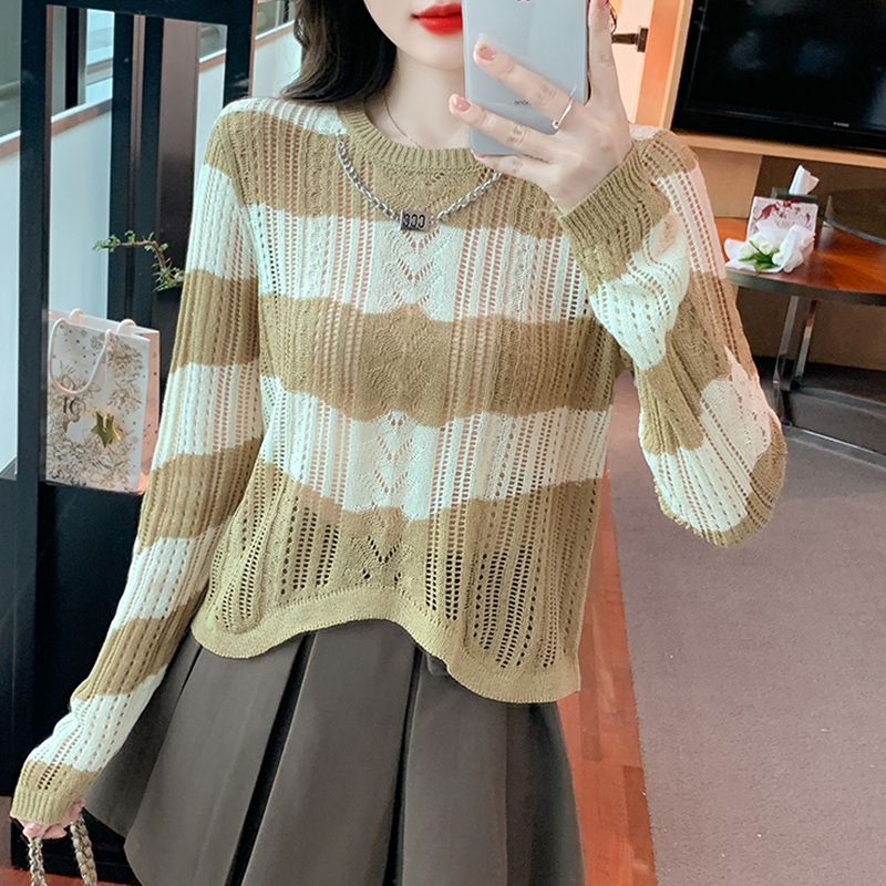 RM22280#气质镂空针织长袖2023最新设计感撞色条纹针织衫秋款女