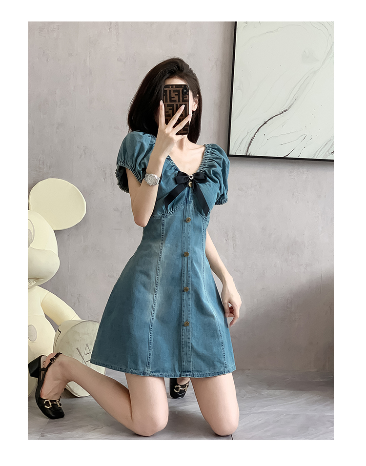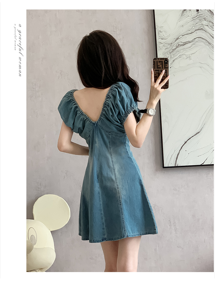 RM22293#复古v领泡泡袖牛仔连衣裙女夏设计感木耳边小众收腰显瘦短裙