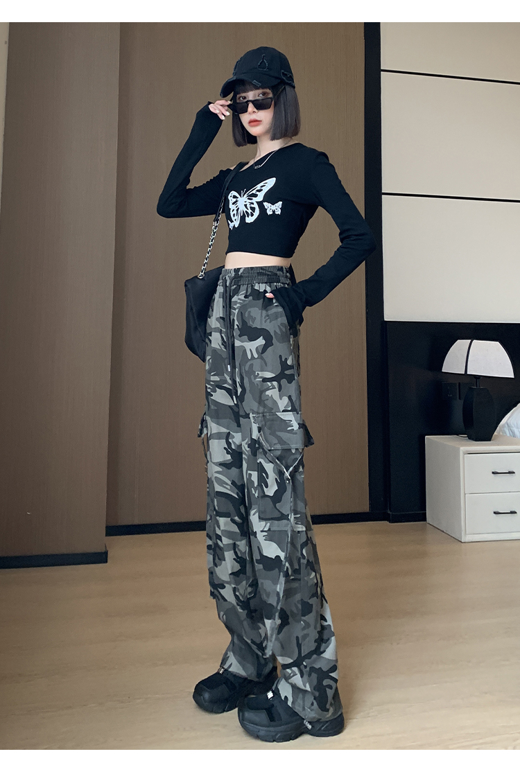 RM22736#复古嘻哈迷彩裤女秋季高街直筒阔腿设计感高腰休闲工装裤子潮