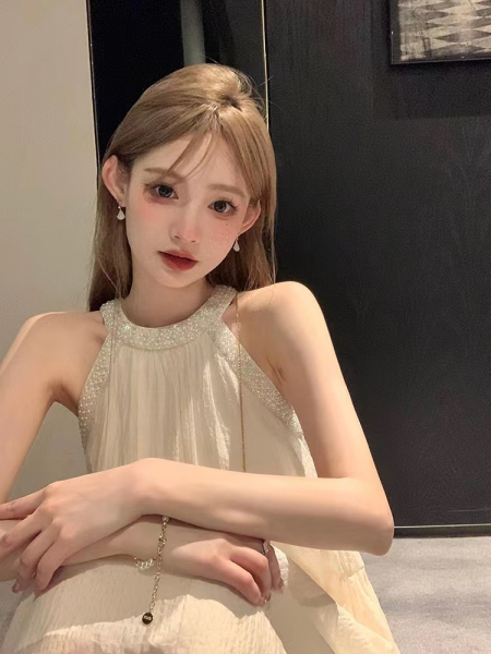 RM23343#纯欲风挂脖式无袖连衣裙子女夏装高级气质感圆领高腰中长款A字裙