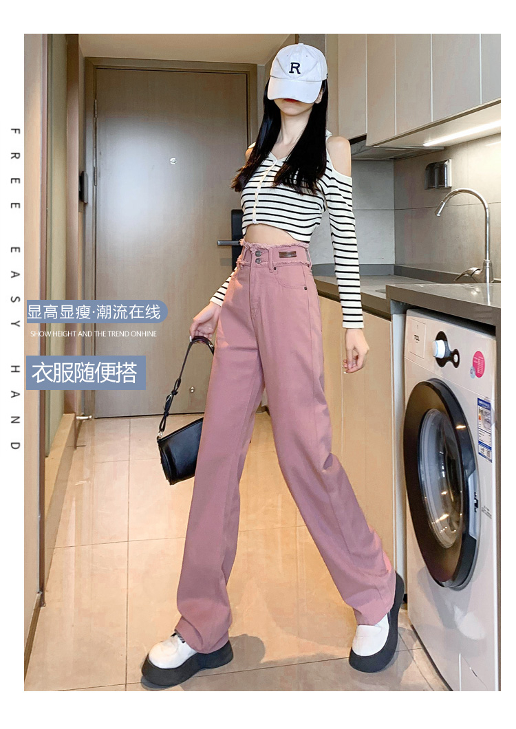 RM23493#脏粉色毛边高腰直筒牛仔裤女宽松显瘦小个子阔腿裤长裤