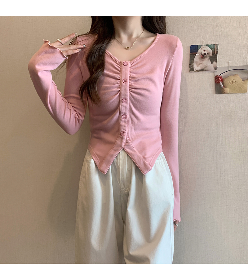 RM23572#V领修身长袖T恤女早秋新款辣妹短款设计感褶皱开叉内搭打底上衣