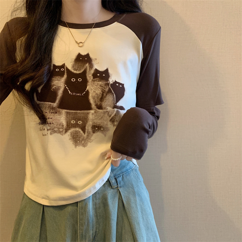 RM23683#新款小心机长袖T恤女韩版辣妹拼色破洞袖高腰上衣女