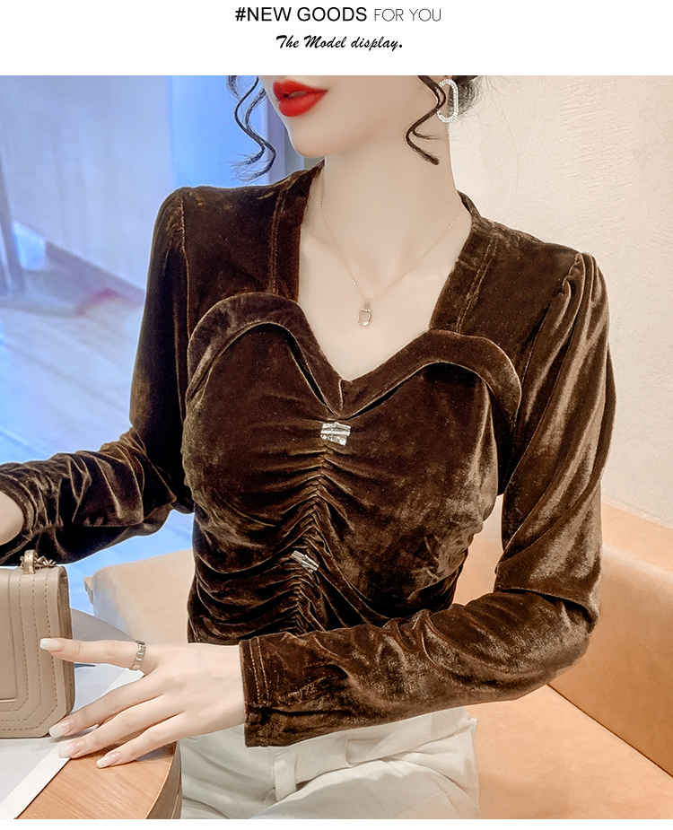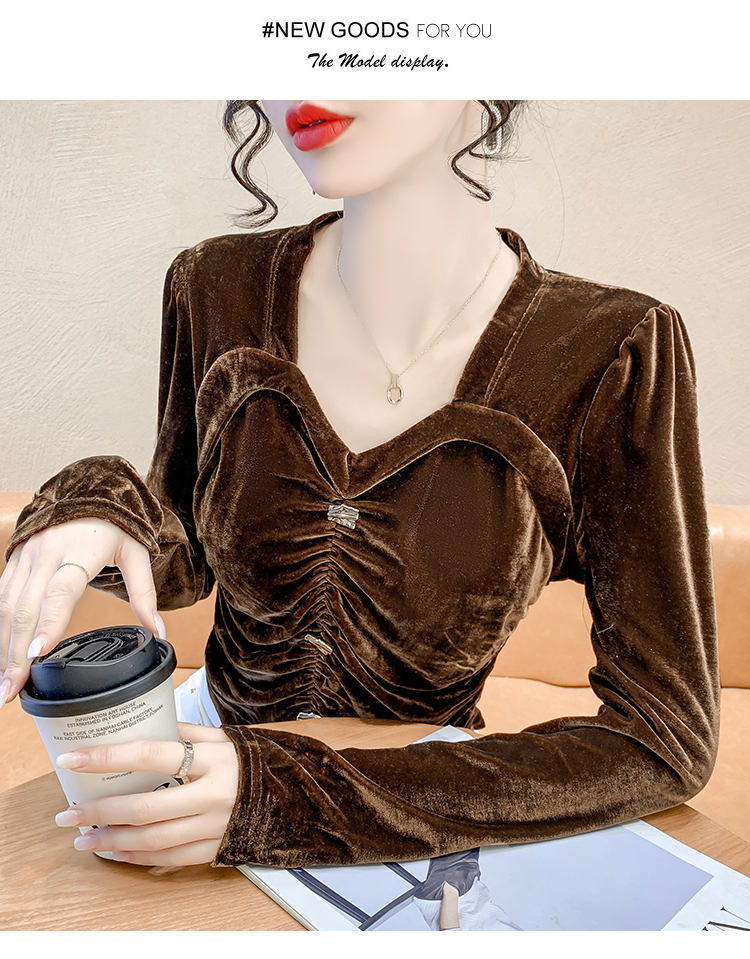 RM23696#金丝绒方领泡泡袖衬衫女欧洲站2023秋季新款百搭修身显瘦气质上衣