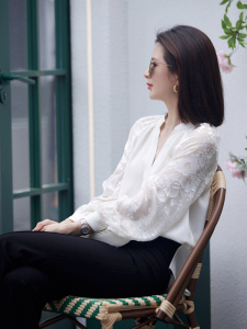 RM23703#夏装法式茶歇上衣别致漂亮小衫高级设计感小众白色仿真丝衬衫