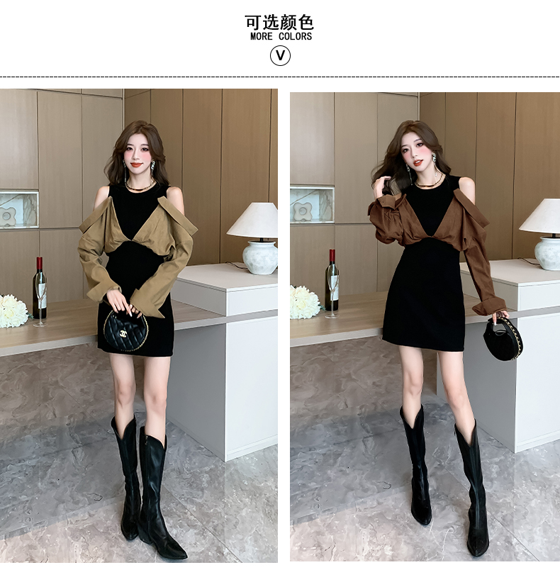 RM23709#新款法式小众露肩拼接灯芯绒连衣裙街拍潮流